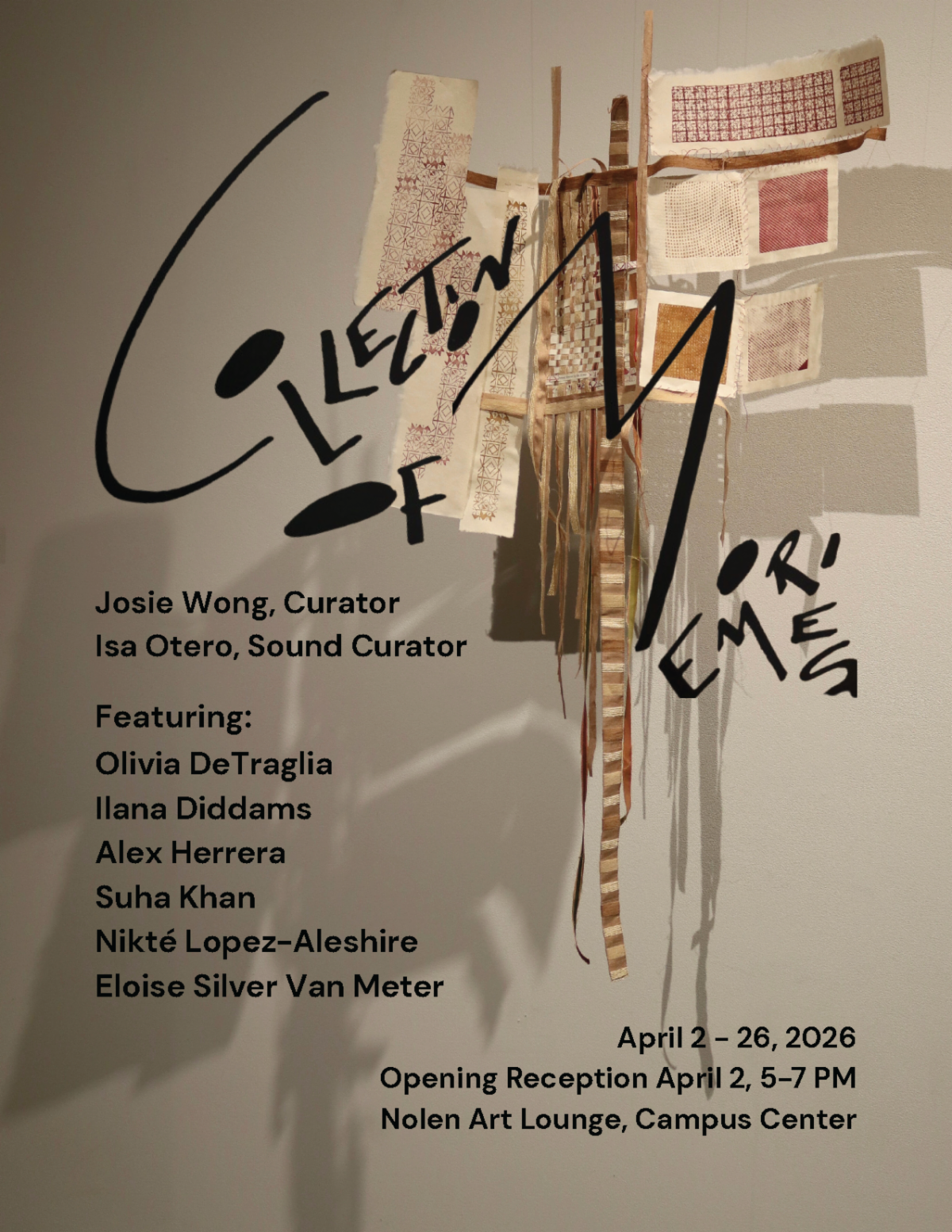 Collection of Memories brings together a group of multidisciplinary artists to explore the sentiment of memory as both a personal and collective force. Memory is the brain’s ability to encode, store, and retrieve information, existing in the mind but also in the body and the soul. These fractured moments are carried across generations and shape who we are today. In this exhibit, a group of artists reflect on the temporality of lived experience and consider how memory is constructed, embodied, preserved, passed down, and transformed over time. Josie Wong, Curator, Isa Otero, Sound Curator, Exhibiting artists: Olivia DeTraglia, Ilana Diddams, Alex Herrera, Suha Khan, Nikté Lopez-Aleshire, Eloise Silver Van Meter. Free and open to the public.