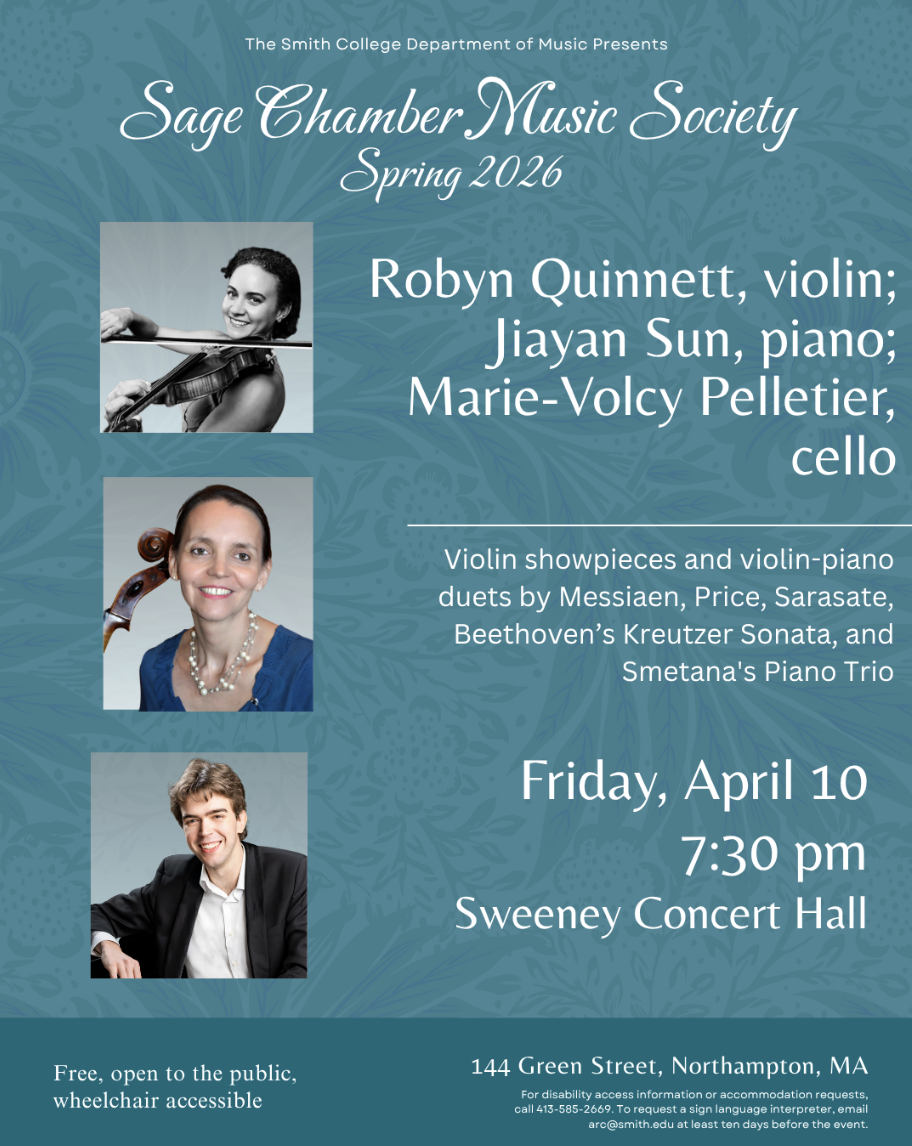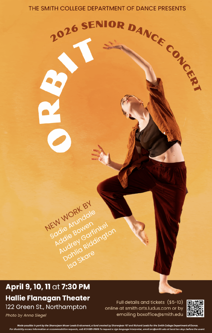 The Smith College Department of Dance presents the Senior Dance Concert featuring the choreography of Sadie Arundale, Addie Bowen, Audrey Garfinkel, Dahlia Riddington, and Isa Skare. Tickets $5-10 at smitharts.ludus.com.