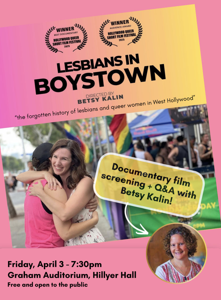 The Film & Media Studies Department presents a screening of LESBIANS IN BOYSTOWN a documentary film that reveals the forgotten history of lesbians and queer women in West Hollywood, the first “gay city” in the US. Betsy Kalin is an award-winning director/producer/writer at Itchy Bee Productions who believes in the power of storytelling to create change by inspiring dialogue and challenging perceptions.